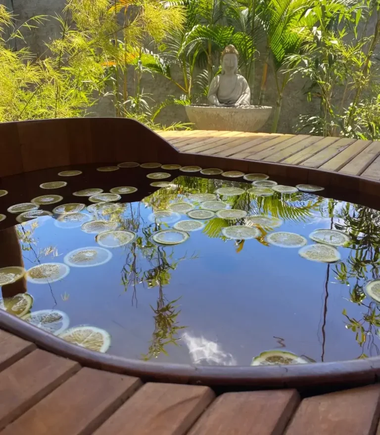 Mergulhe em um banho de ofurô aquecido ao ar livre, cercado pela exuberante vegetação. As pedras de shungite potencializam o efeito detox, enquanto a água quente relaxa os músculos e acalma a mente. Deixe-se envolver pela sinfonia da natureza e sinta as tensões dissiparem-se em meio ao vapor e aos aromas naturais.
